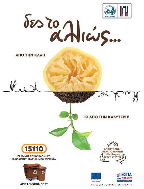 Ο δήμος Πειραιά υλοποιεί ένα πιλοτικό πρόγραμμα χωριστής συλλογής και διαχείρισης βιοαποβλήτων με τίτλο «Δες το αλλιώς», διαθέτοντας δωρεάν καφέ οικιακούς κάδους συλλογής βιοαποβλήτων μαζί με ειδικές βιοδιασπώμενες σακούλες, ενώ παράλληλα τοποθετεί καφέ κάδους στις γειτονιές του Πειραιά.