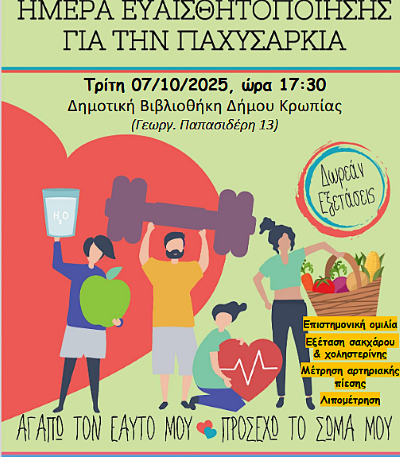 Ο δήμος Κρωπίας, το Κ.Ε.Π. Υγείας και το Ελληνικό Διαδημοτικό Δίκτυο Υγιών Πόλεων του Π.Ο.Υ. διοργανώνουν τη δράση «Ημέρα ευαισθητοποίησης για την παχυσαρκία» το απόγευμα (17.30) της Τρίτης 7 Οκτωβρίου στη Δημοτική Βιβλιοθήκη Κορωπίου (Ολυμπιονίκη Γεωργίου Σαράντη Παπασιδέρη 13, πεζόδρομος), με το ακόλουθο πρόγραμμα: