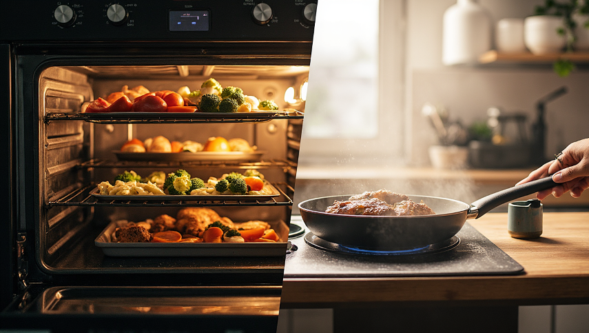 - Πρακτικότητα και ευκολία. Ο φούρνος επιτρέπει μαγείρεμα «hands-off». Τοποθετείς το ταψί, ρυθμίζεις θερμοκρασία και χρόνο και μπορείς να ασχοληθείς με άλλα καθήκοντα, χωρίς την ανάγκη συνεχούς επίβλεψης ή ανακατέματος. Στο τηγάνι το φαγητό απαιτεί διαρκή παρουσία για να μην κολλήσει ή καεί. Η πρακτικότητα αυτή τον καθιστά ιδιαίτερα χρήσιμο εργαλείο για πολυάσχολες οικογένειες, για όσους μαγειρεύουν μεγάλες ποσότητες και για όσους θέλουν να διαχειρίζονται καλύτερα τον χρόνο τους.